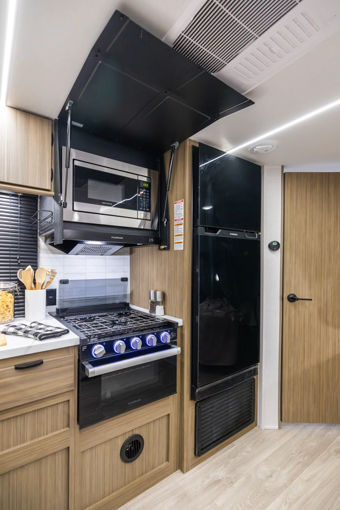 The 240BHXL weighs in at less than 6,000 lbs. for increased towability, without sacrificing any of the comfort! This double-over-double bunkhouse packs a lot of features into its 28'10” length, including a large comfy booth dinette with panoramic windows, walk-in pantry, modern kitchen with stove, cooktop, microwave, and an oversized refrigerator! The bathroom provides a walk-in shower with skylight and a convenient second door to the outside.