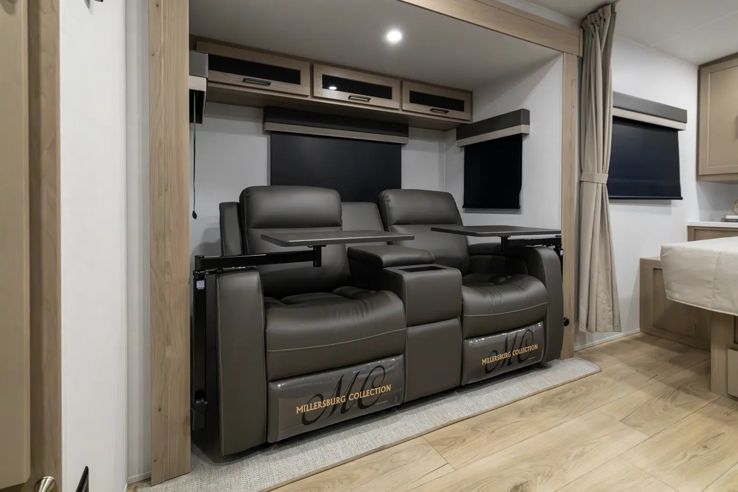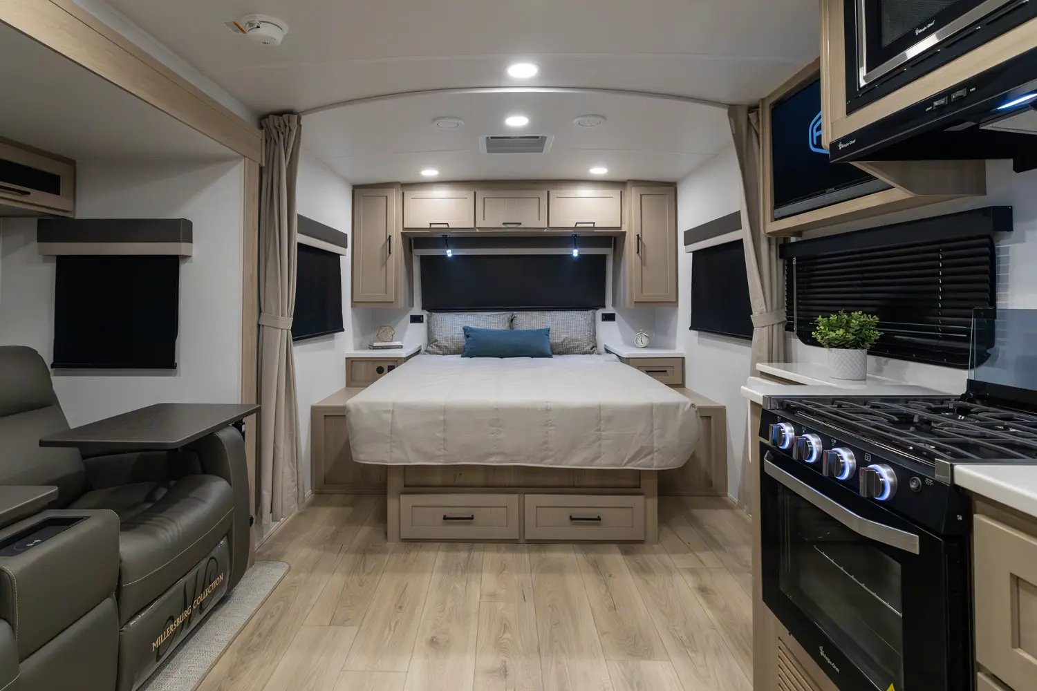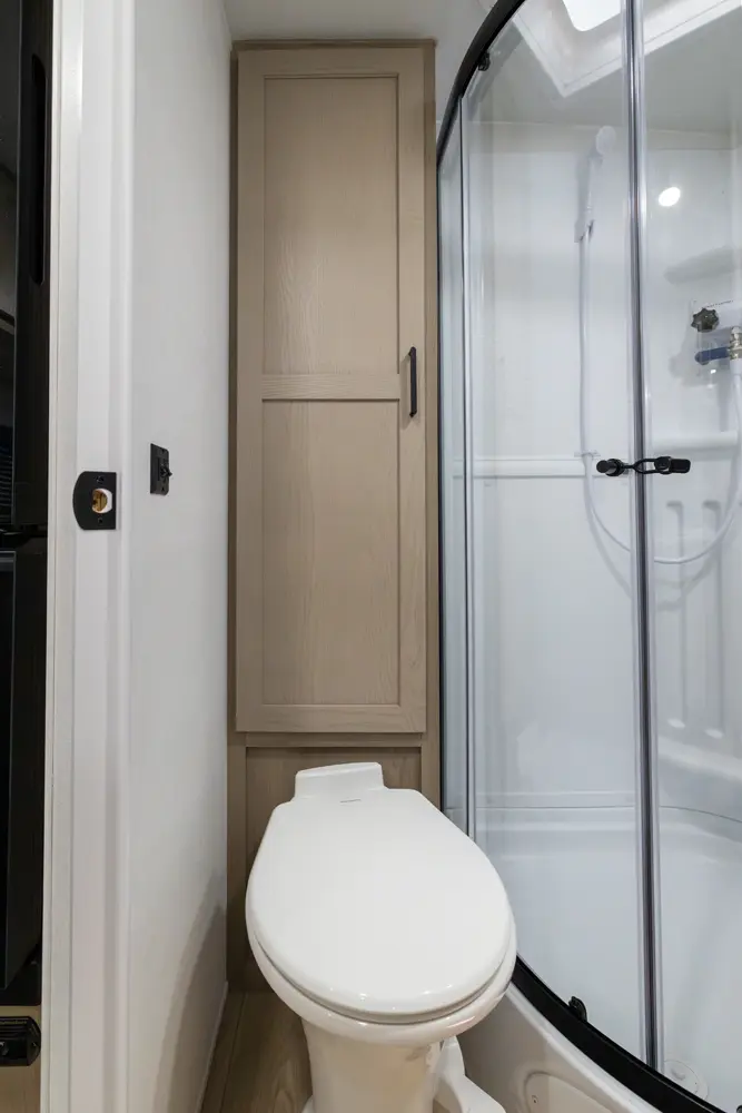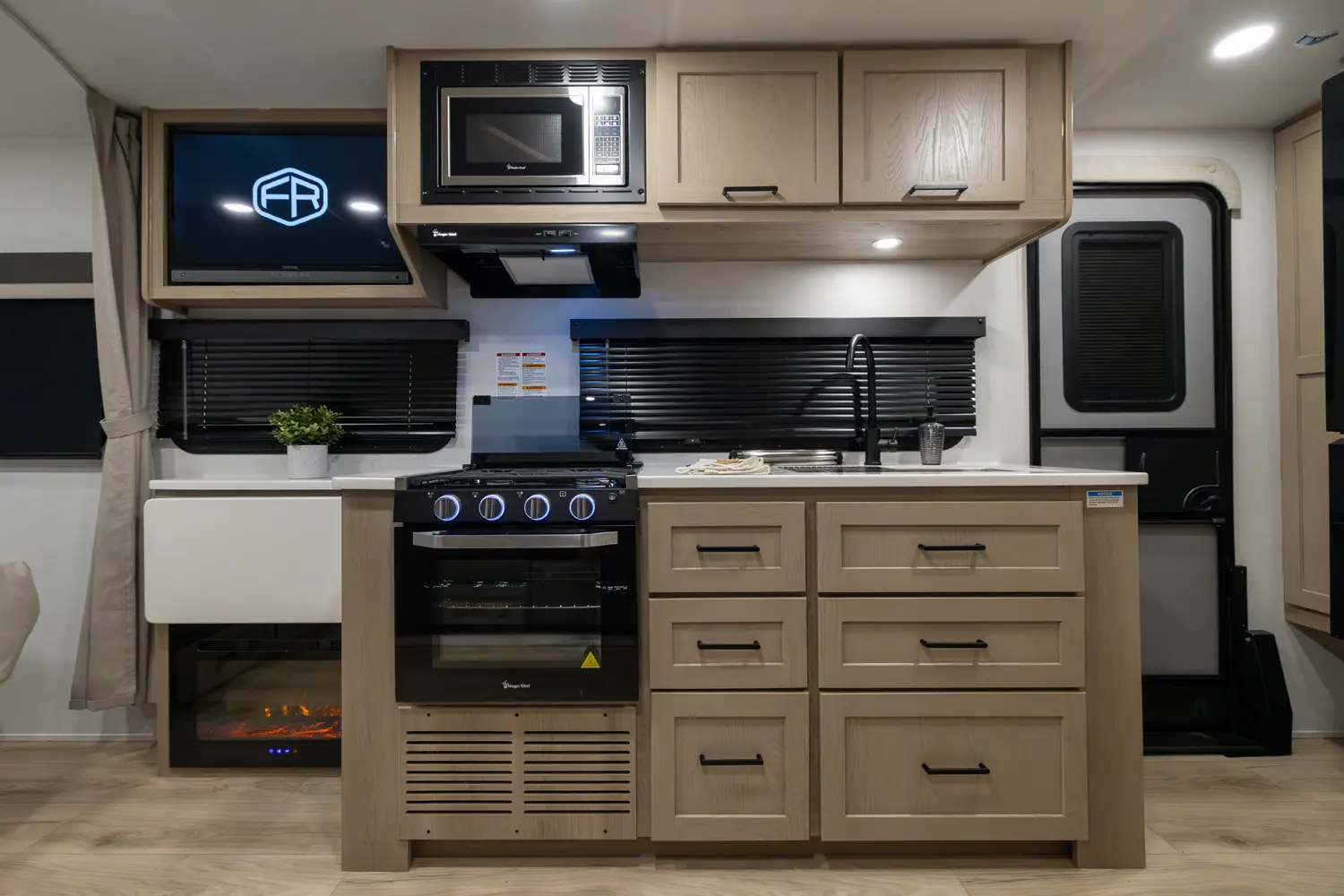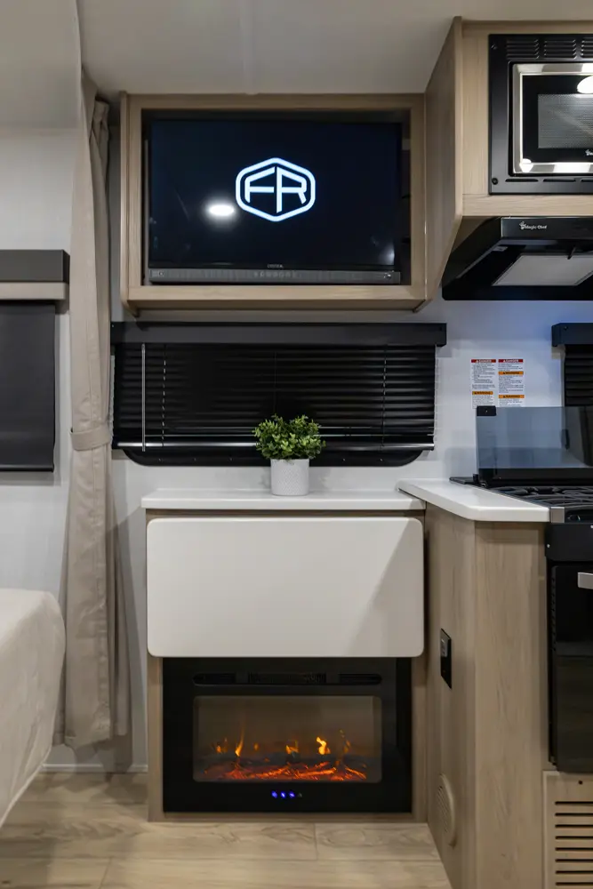 This revised floorplan features wide open living space and a drop frame for large front pass through storage. The baggage door on the front pass through is 30” by 24” which will accommodate all your camping accessories. The floor space in this unit caters to pet-friendly campers with room for kennels and large animal sleeping areas. If you and your pet want to cuddle up next to a nice warm fireplace with some family members on the theater seating, this is the unit for you.