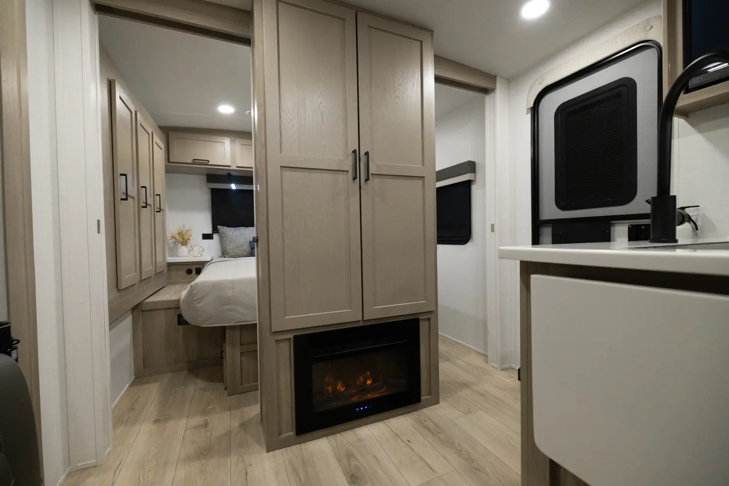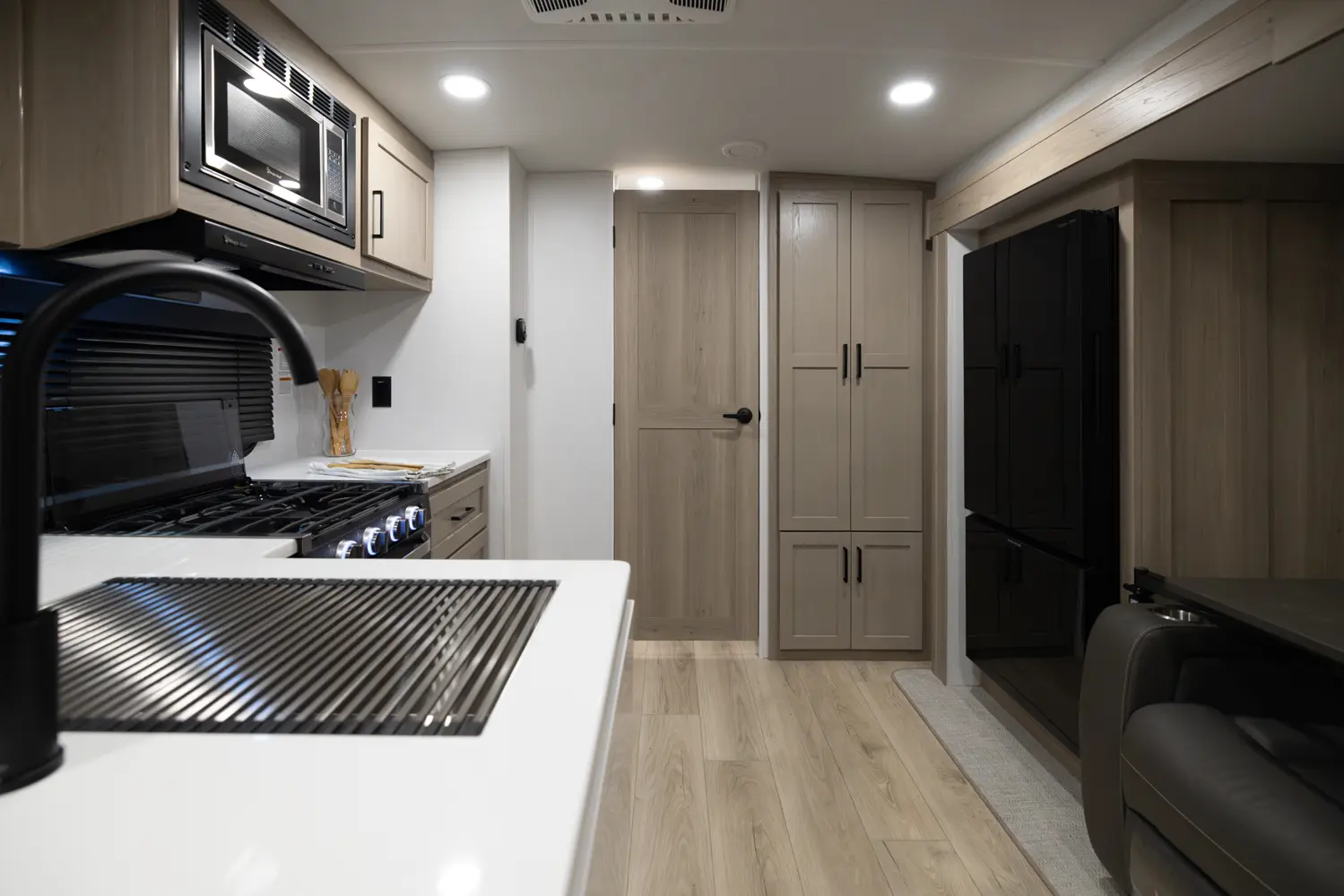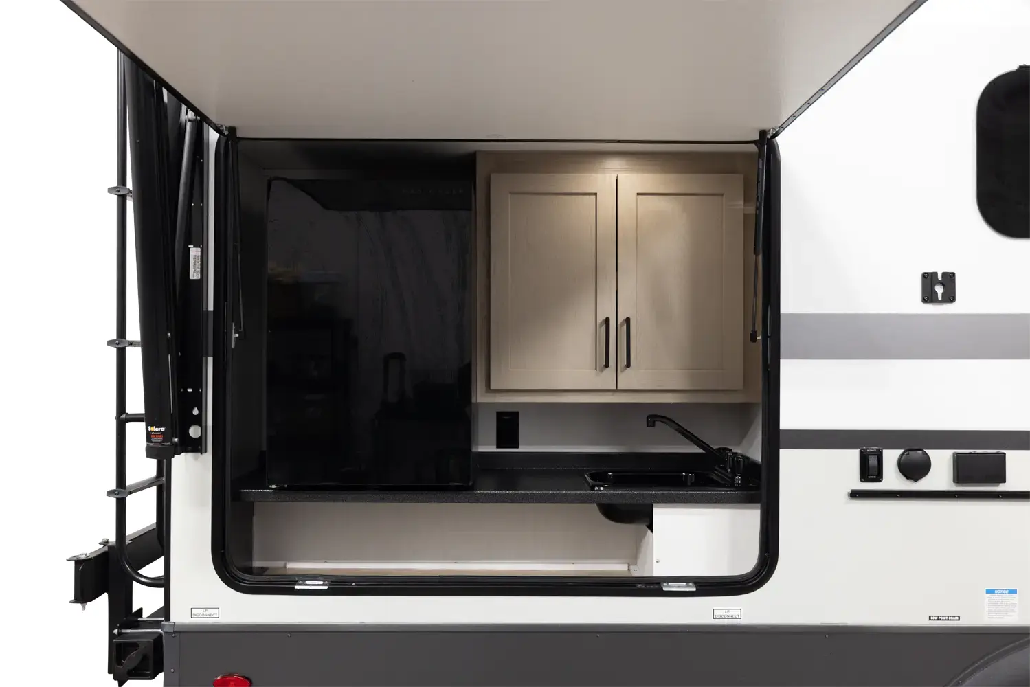 The outside kitchen on this Flagstaff Micro Lite featuring our new griddle, a refrigerator and grill makes cooking so enjoyable and flexible. No need to take the smell of cooking bacon inside. The large wardrobe slide makes packing and organization so easy. The large pantry next to the bathroom covers all your kitchen storage needs as well. The center position of the television in your entertainment spaces makes viewing from any part of the living quarters easy.