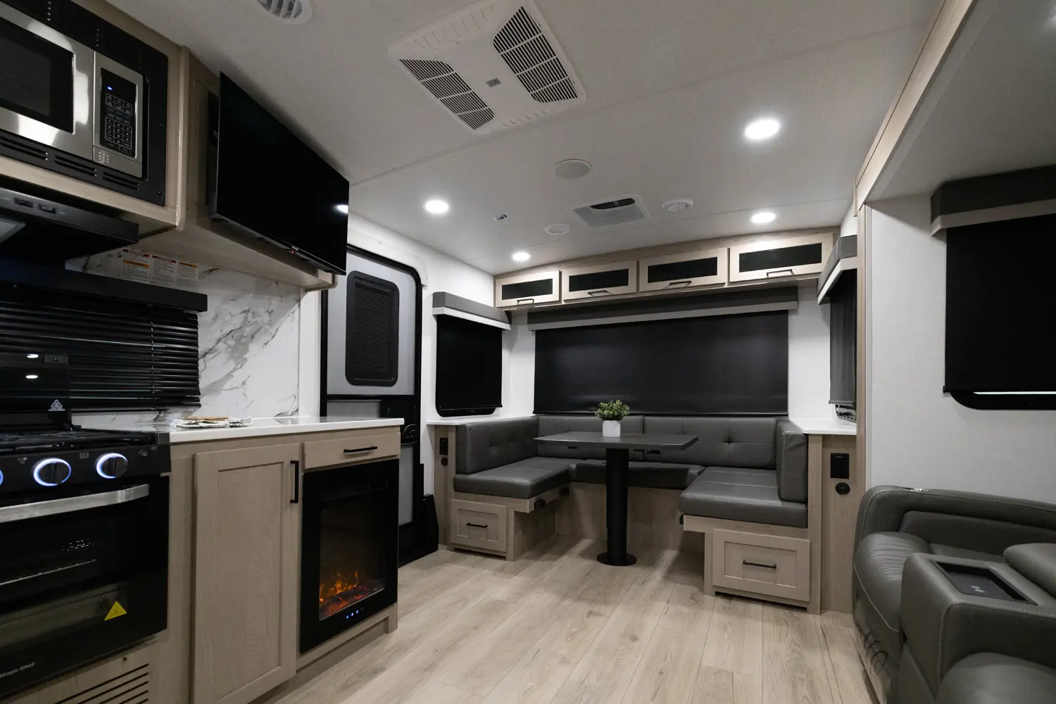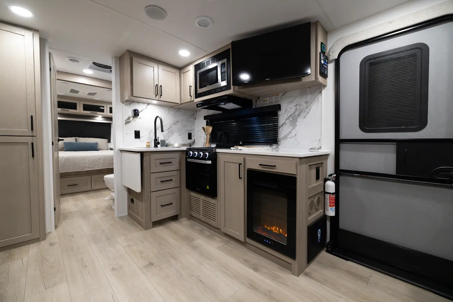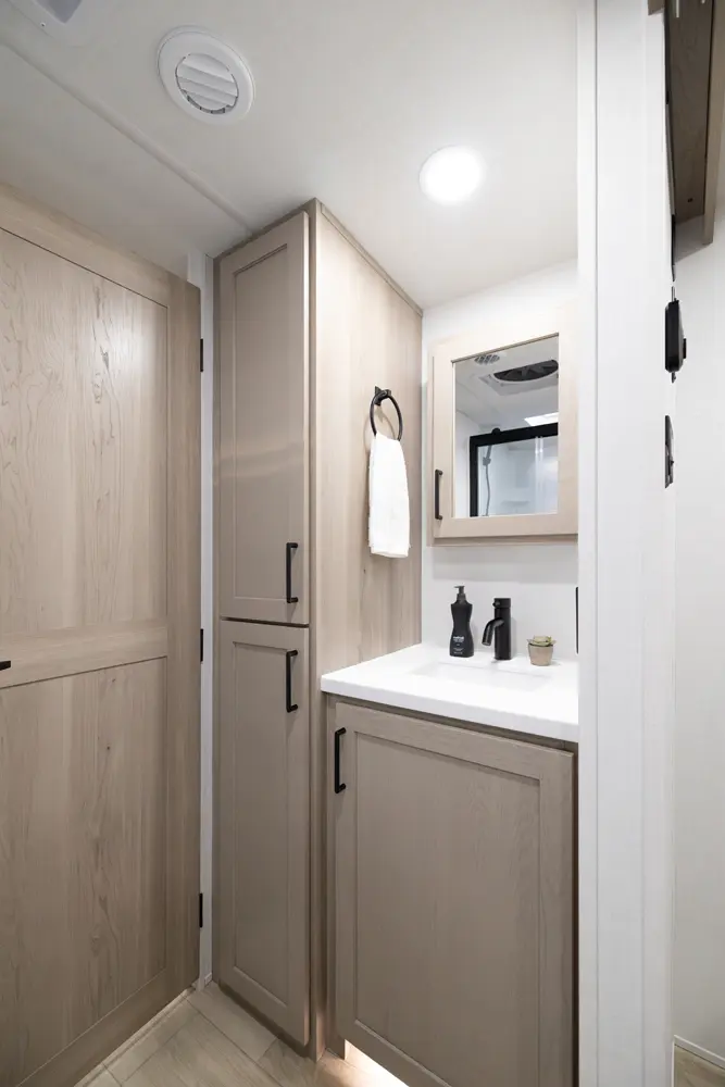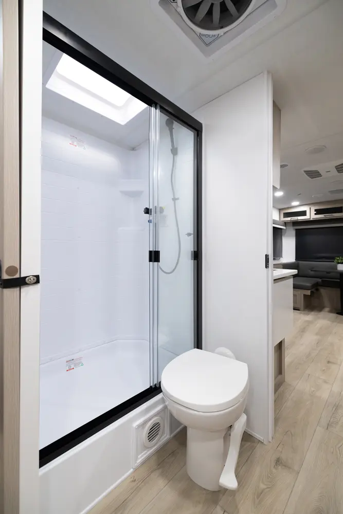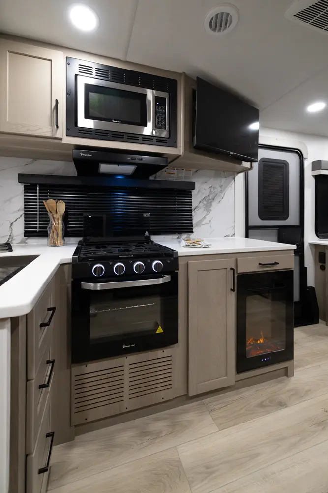 • Platinum Package: Auto Leveling, Frameless Windows, 1800W Inverter, MORryde Strut Assist Entry Step, Dual 30 LP Tanks