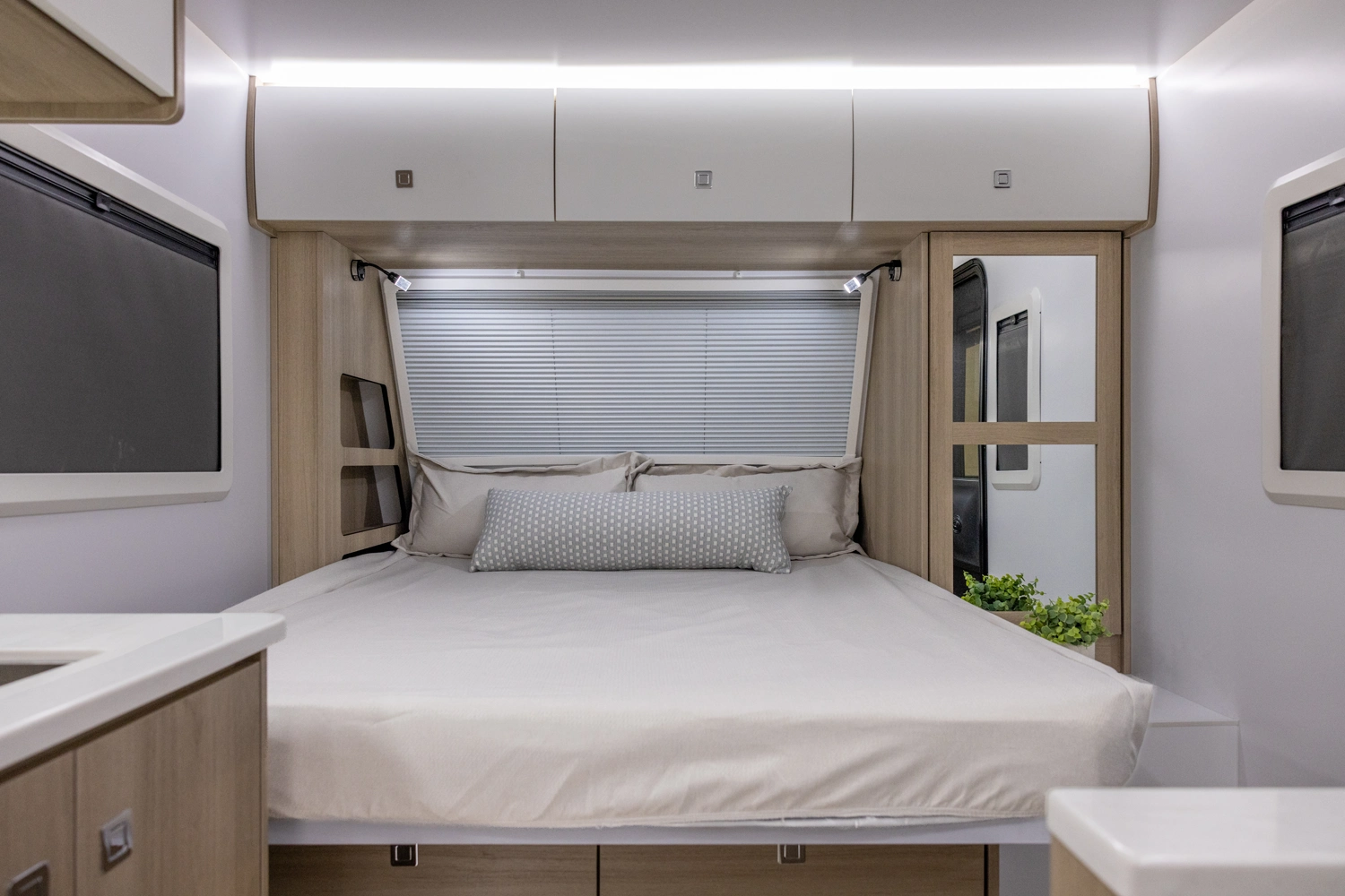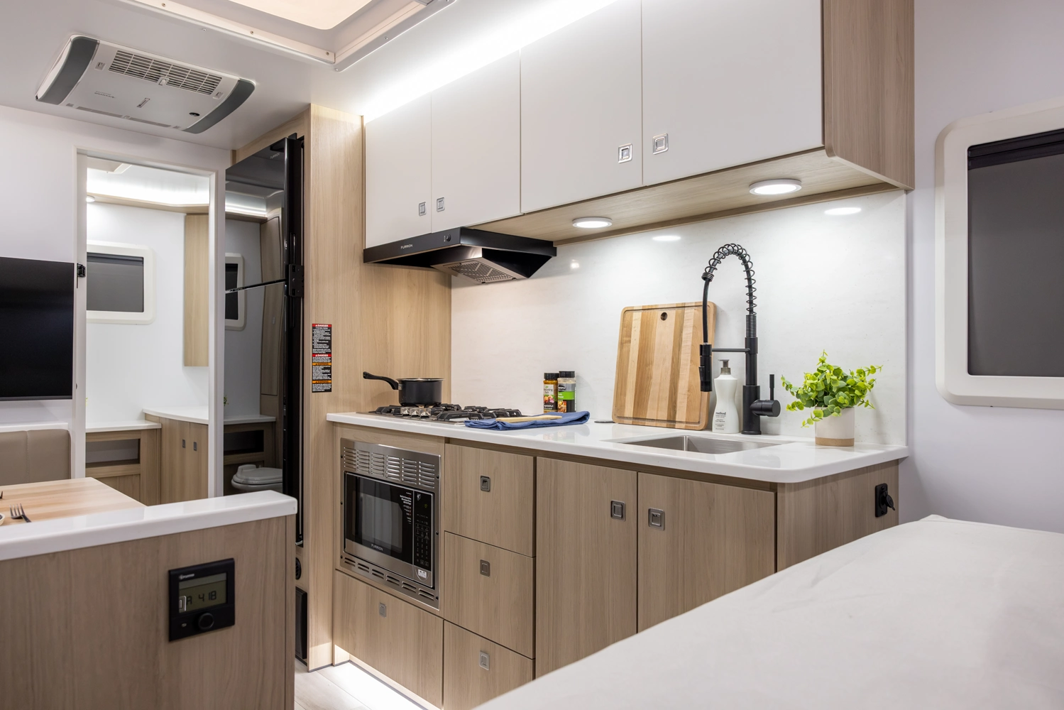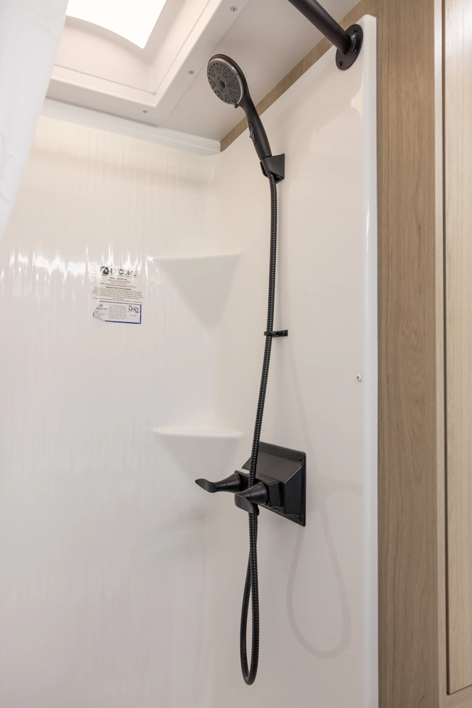 This floorplan provides all necessities without compromising space! It features a full-size queen bed, a 4-person dinette that converts to a bed, and ample bathroom counter space, ensuring comfort for everyone. The oversized passthrough storage compartment offers room for everything you need. Cooking is easy with a 3-burner cooktop, convection microwave oven, a 10.7 cu ft refrigerator, 6 cabinets, and 4 drawers. The robust solar system allows all components to operate without being plugged in.