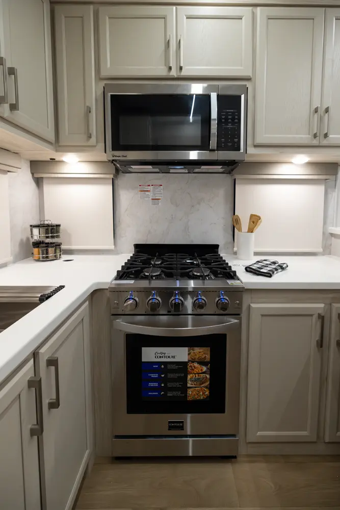 • Stainless Steel Residential Style Appliance Package w/18 Cu Ft 12V Refer and Large Range