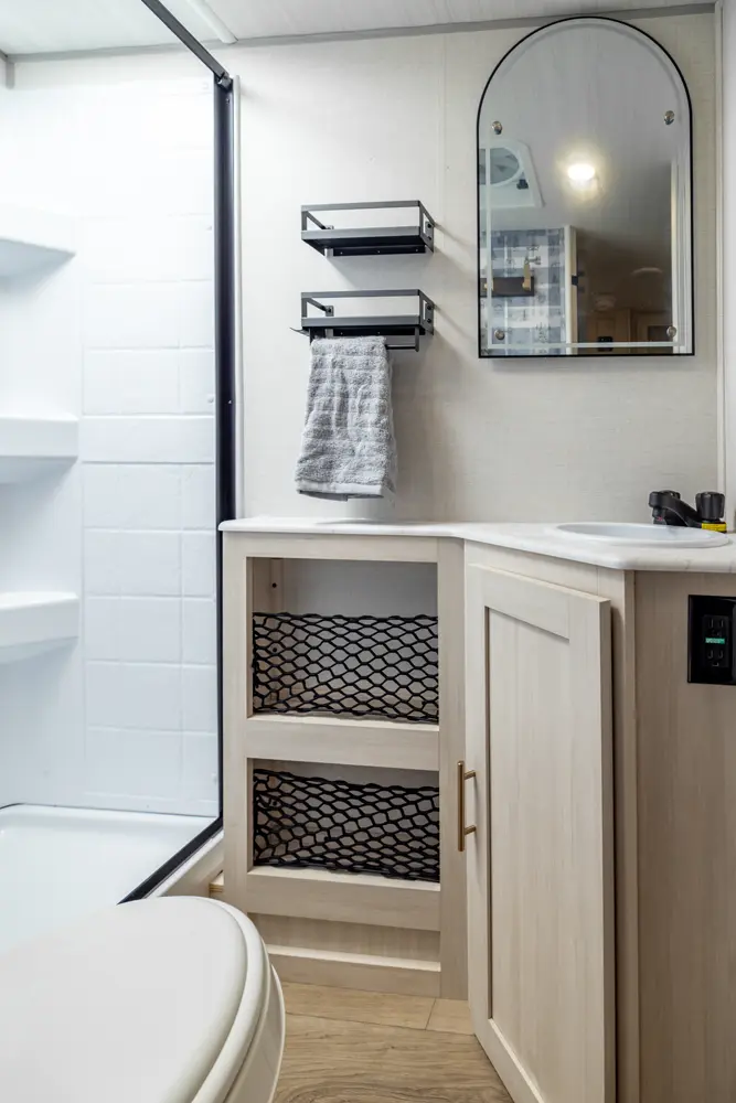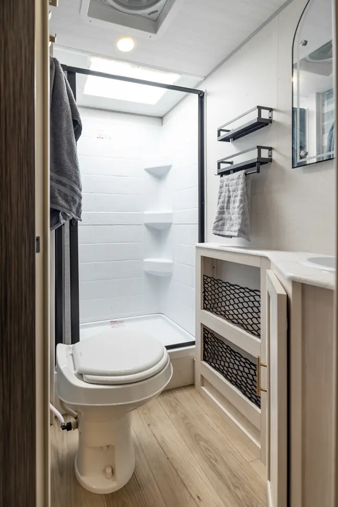 The RP-205 blends lightweight towing with a spacious layout. A private queen bedroom offers comfort and privacy, while the rear corner kitchen and booth dinette create a functional living space. The full bath adds convenience, and the theater seating enhances comfort. With modern finishes and smart storage, this no slide trailer is ideal for couples or small families seeking compact, full-featured adventures.