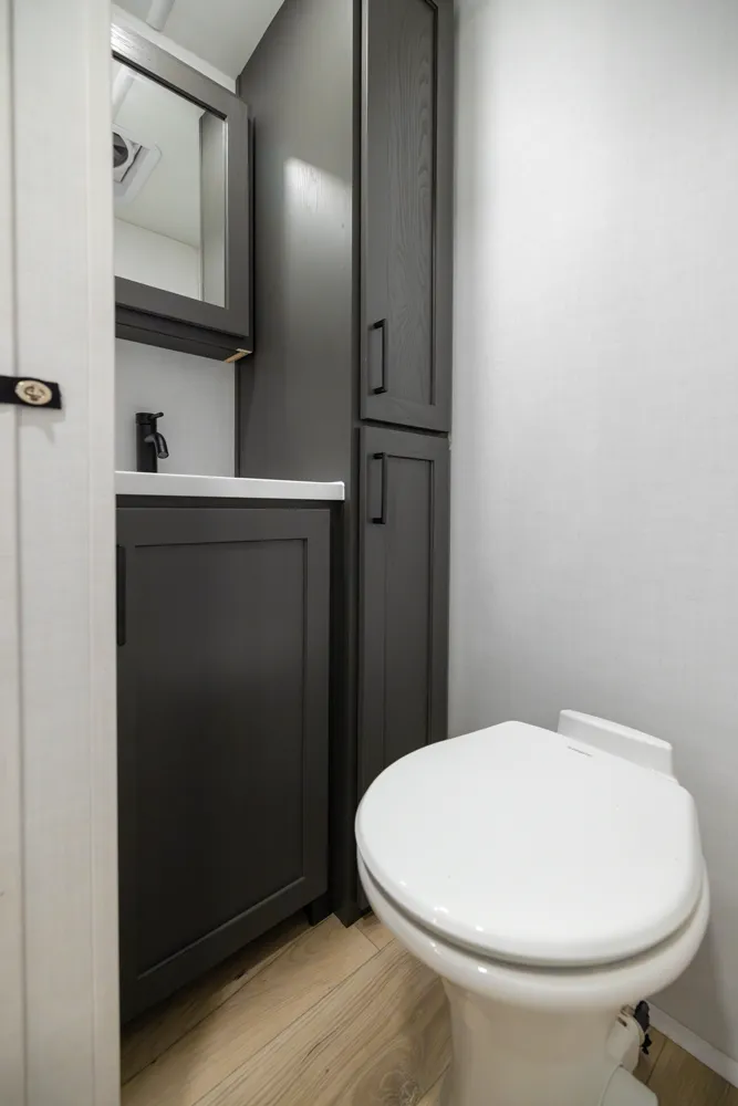 The Rockwood 2918BH features a front bedroom with a true queen bed and a large master bathroom with shower. The spacious living area and kitchen include theater seating and a dinette for comfort and dining. A rear half-bath and segregated bunk room provide privacy and convenience, making the 2918BH ideal for families seeking versatile space and comfort on the road.
