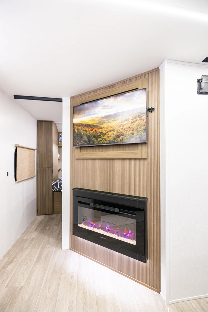 The 26DBUD is the perfect family travel trailer, with double bunks at one end and a queen bedroom at the other. You also get a fireplace (heater), full kitchen with glass-fronted cabinetry and large pantry, a U-dinette, and the customizable Versa-Lounge with Stow N Go Storage.