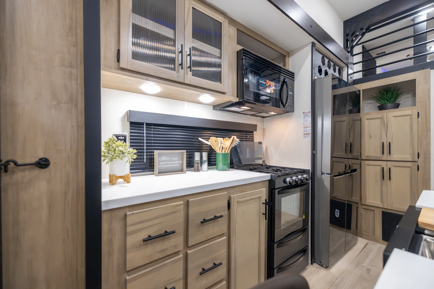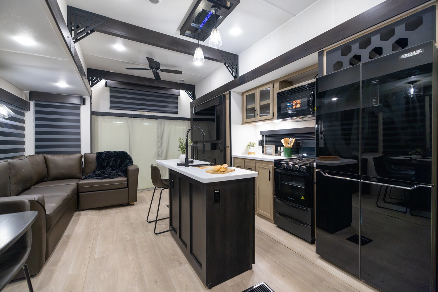 • Cherokee Black Label Timberwolf (Deep Tinted Frameless Automotive Glass Windows, High Gloss Gel Coat Exterior Sidewalls, Multicolor Reading Lights, Pillowtop Mattress Upgrade, Thermo Foil Arctic Insulation, Wall Controlled Power Shades for Living Room and Kitchen)