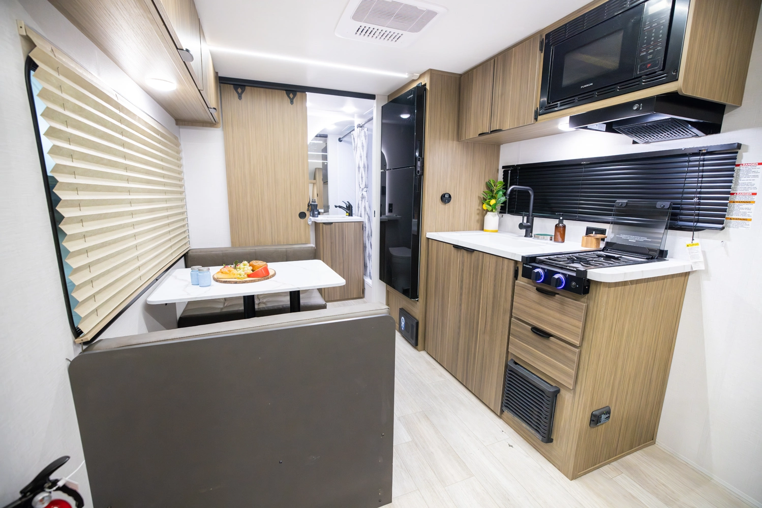 The 167RBK is just over 3,000 lb. of compact, yet feature-packed fun! The queen bed in front flips up to provide sofa space during the day, with end tables for extra storage and convenience. The booth dinette and large window give you great breakfast views, while the large rear bathroom provides a bit more elbow room than you'd expect—plus a bonus linen cabinet!