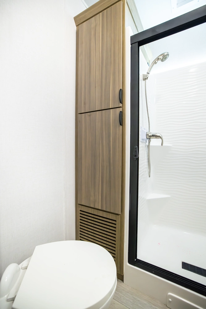 The 40RLB is an open floorplan that maximizes space for a residential cottage look and feel. The large king bedroom provides plenty of storage and washer/dryer hookup. The bathroom offers a walk-in shower with built-in seat, skylight, and linen cabinets. The island kitchen provides residential appliances and plenty of room for all the cooking essentials. Don’t forget the awesome view out the panoramic windows.