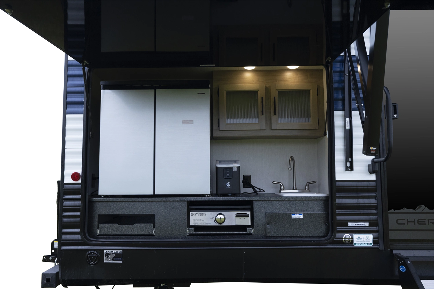 • Cherokee Black Label Wolf Den (Deep Tinted Frameless Automotive Glass Windows, High Gloss Gel Coat Exterior Sidewalls, Multicolor Reading Lights, Pillowtop Mattress Upgrade, Solid Surface Countertops, Thermo Foil Arctic Insulation)